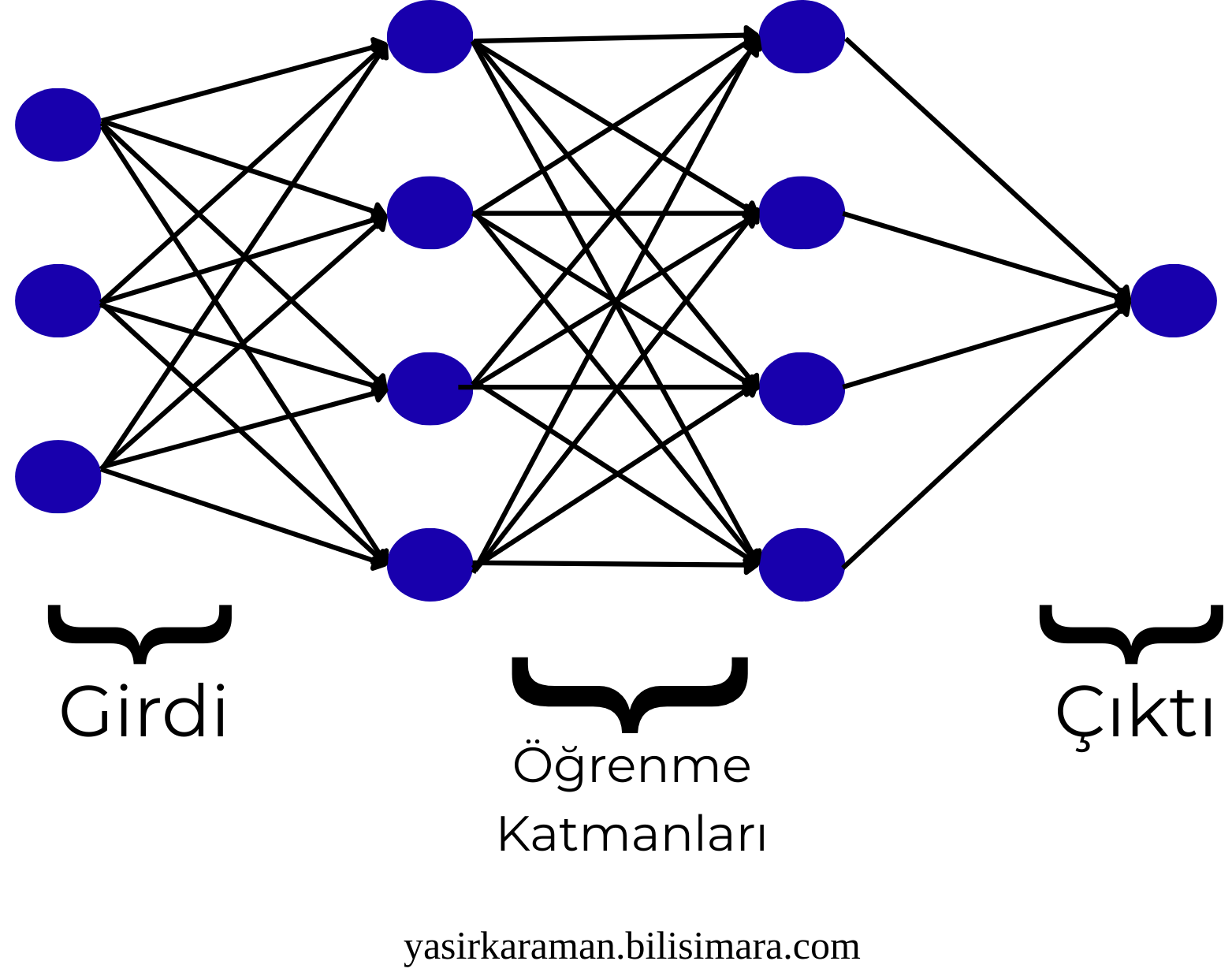 Yapay Sinir Ağları veriyi işlerken Girdi, Öğrenme Katmanları (Gizli) ve Çıktı olmak üzere 3 temel katmandan oluşur bu katmanlar tıpkı bir çocuğun deneme yanılma yoluyla öğrenmesi gibi çalışır. Süreç verinin İleri Yayılım (Forward Propagation) ile başlar burada her nöron kendisine gelen verileri belli matematiksel Ağırlıklar (Weight) ve Sapma (Bias) ile değerlendirilir sonra diğer katmana iletilir. |