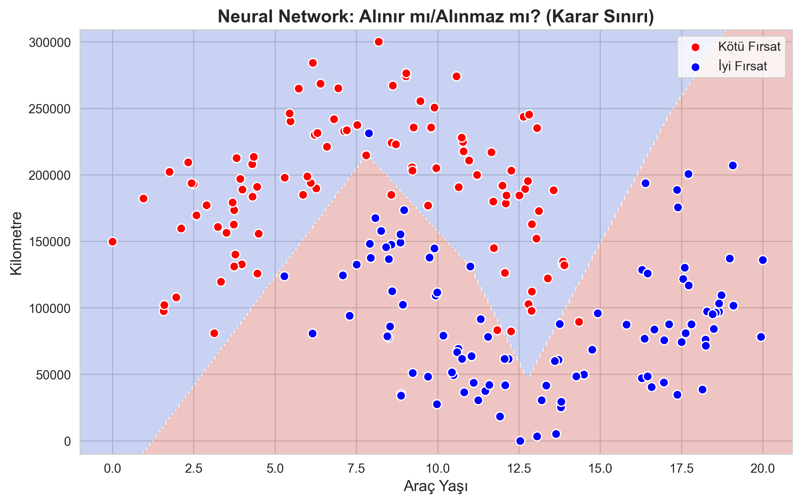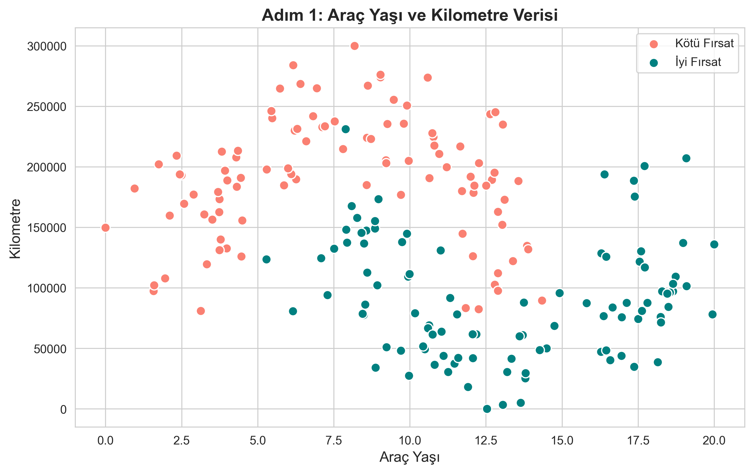 Tabloda görüğümüz İyi Fırsat ve Kötü Fırsat arabalar listelenmiştir şimdi Yapay Sinir Ağları ile bunları sınıflandıralım ve sınırlar çizelim çizdiğimiz sınır çizgileri sayesinde yeni arabalar eklendiğinde bunu hızlı biçimde sınıflandırabilelim.